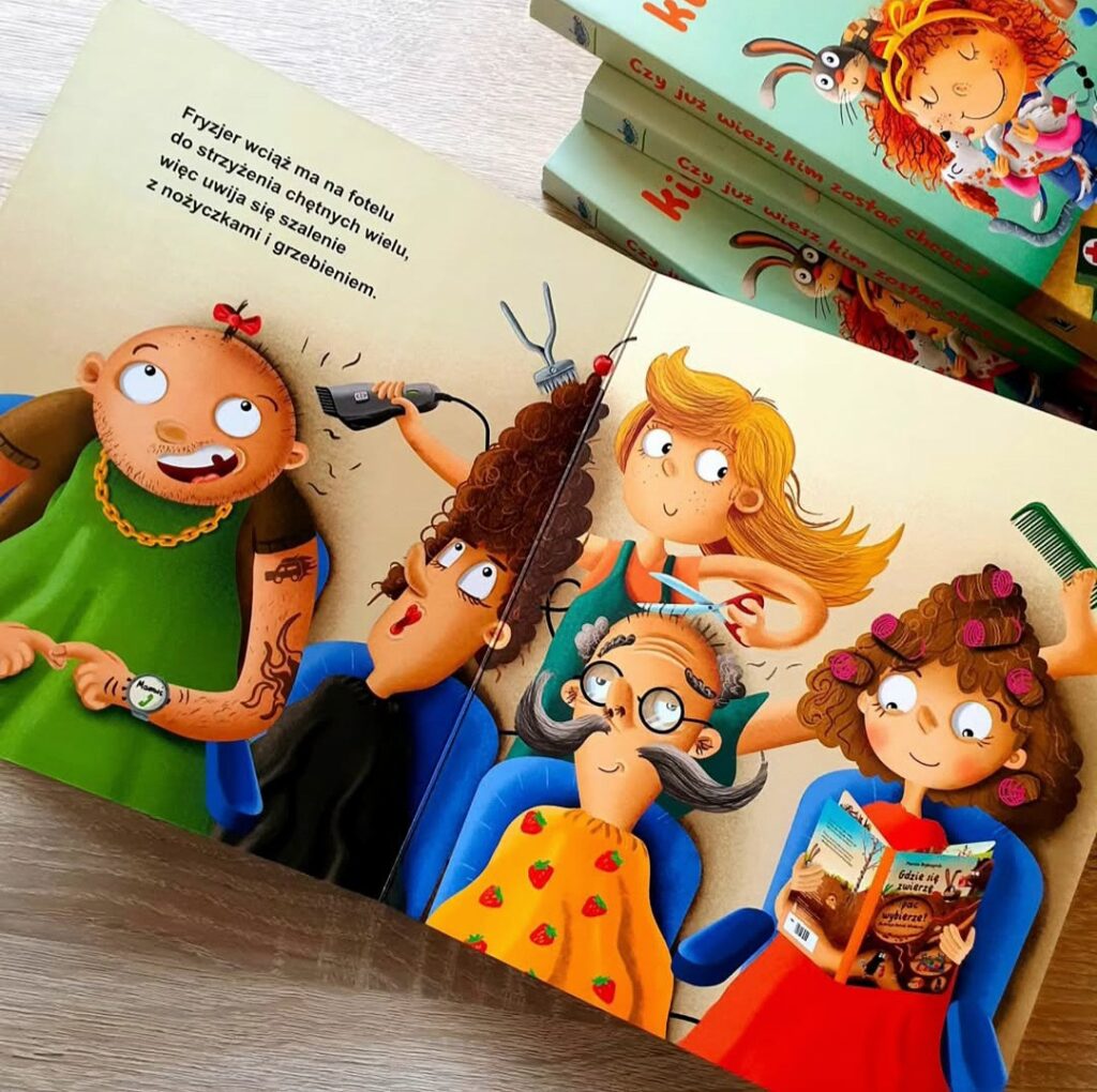 Sometimes, funny scenes, interesting characters, and a simple background are all you need. Not every illustration needs to be incredibly detailed. A skilled hairdresser cutting a multitude of different people can be depicted in a hair salon, but if the book is funny, spice it up a bit. Children don’t like sad and boring illustrations. Waiting in line can be boring, but you have to be creative.